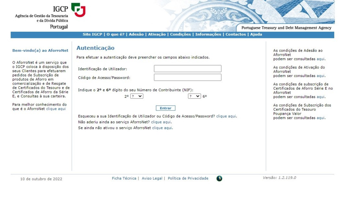 O AforroNet é um serviço disponibilizado pela Agência de Gestão da Tesouraria e Dívida Pública (IGCP), destinado a particulares e pensado para a gestão de produtos de poupança, onde poderá fazer pedidos de subscrição de produtos de aforro em comercialização ou resgate de certificados do tesouro e de certificados de aforro da Série E, bem como consultar o valor da sua carteira com base diária ou mensal. O acesso é gratuito e pode ser efetuado através do site www.igcp.pt ou diretamente em aforronet.igcp.pt. ​​​​​​​
